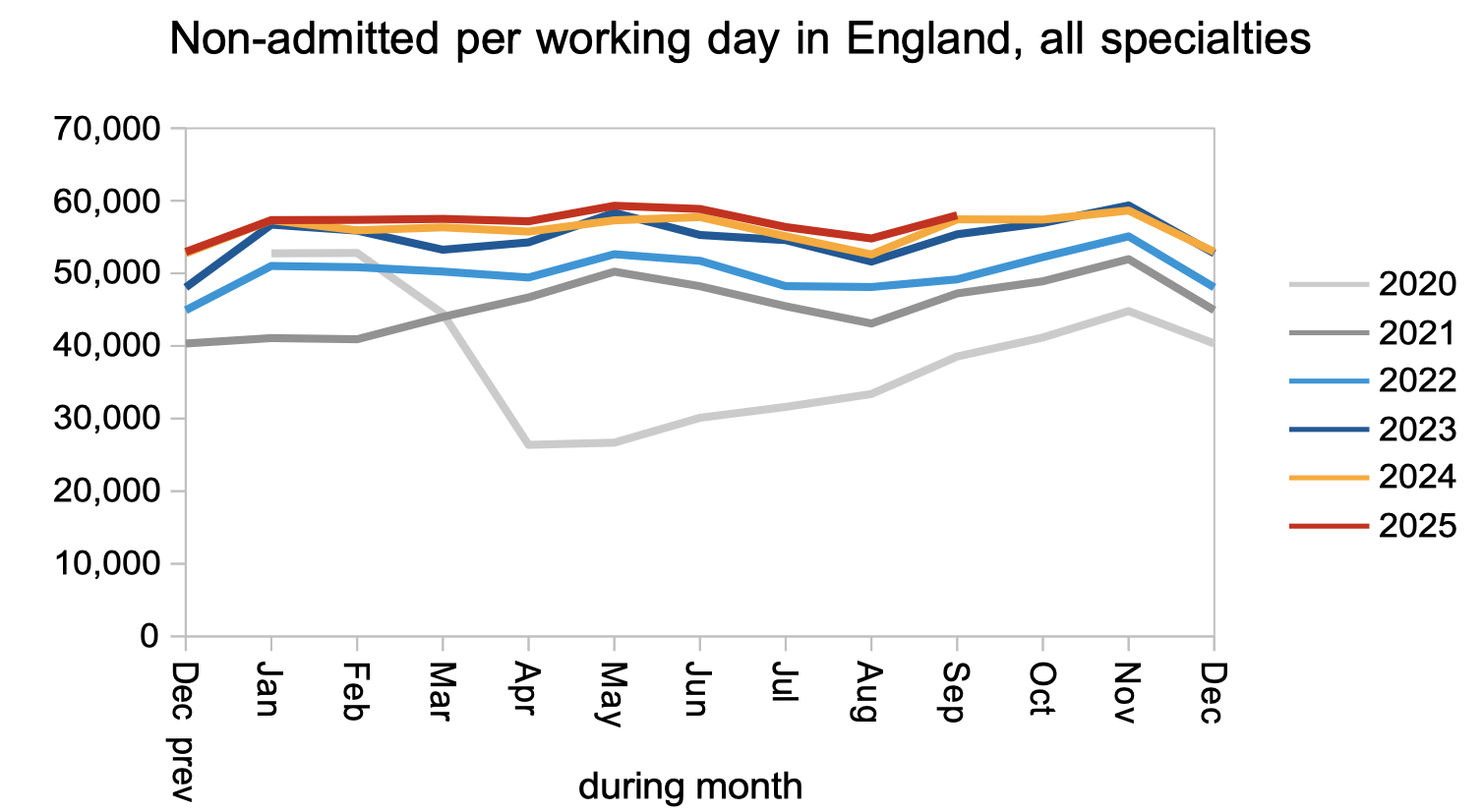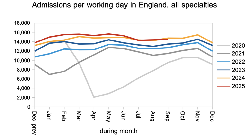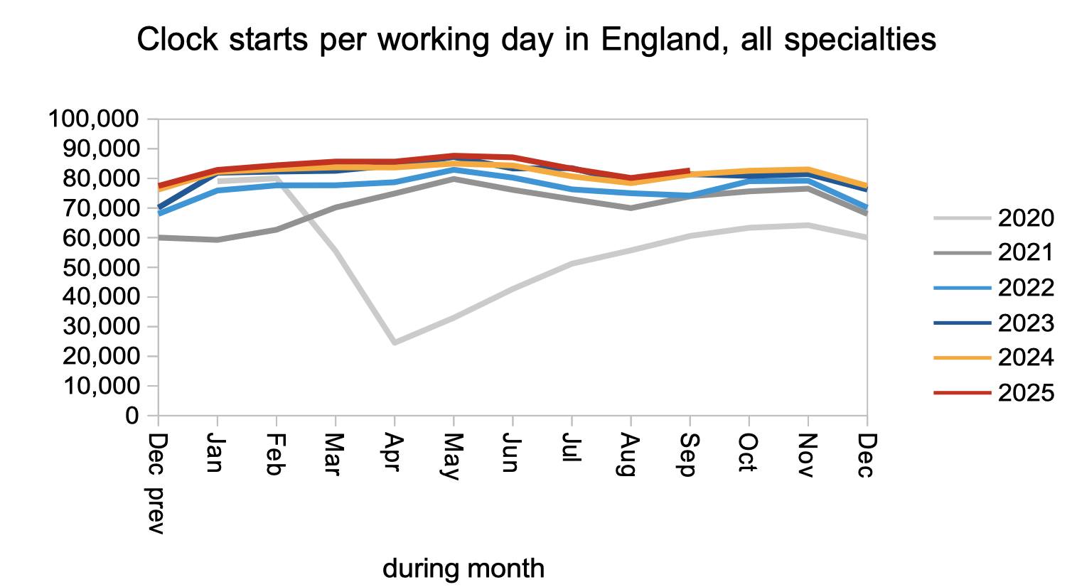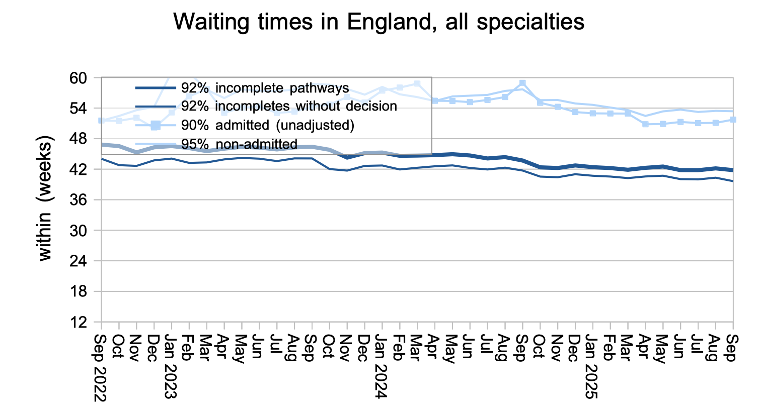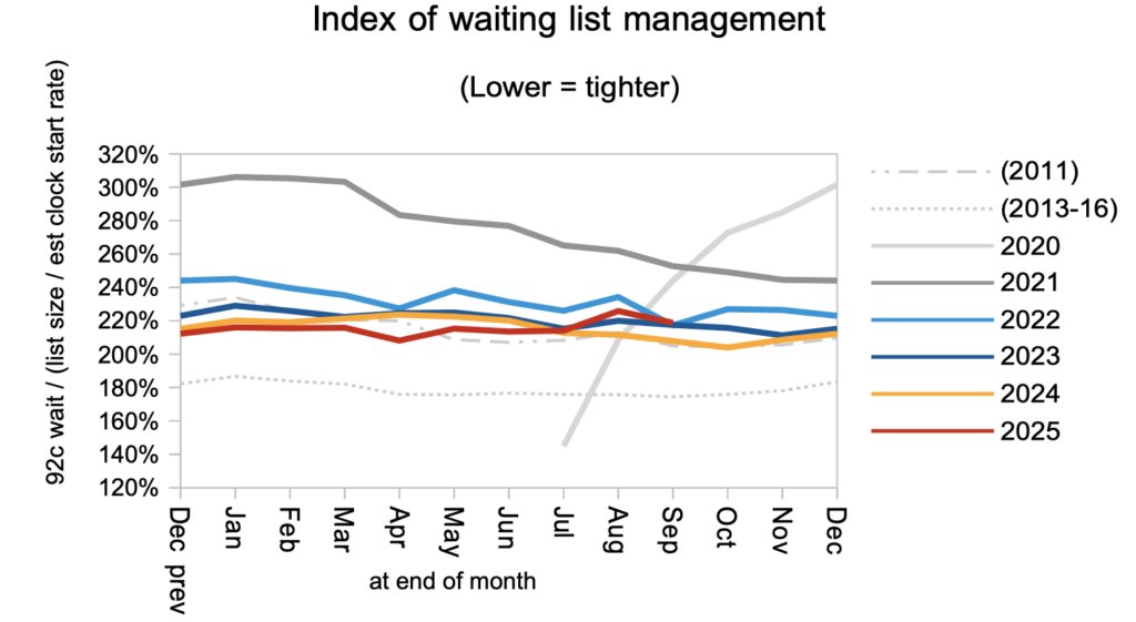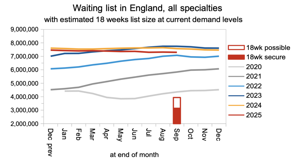 But the NHS has bigger ambitions than steady-state: it aims to tackle the post-covid backlog and restore the ’18 weeks’ waiting times standard by March 2029. That requires a big reduction in the waiting list, with September’s share of the reduction being some 98,000 pathways.