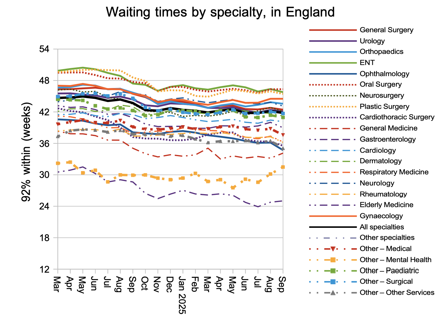 The overall picture on waiting times is mostly reflected in each specialty separately. Mental Health waiting times appear to be rising again, but this is difficult to interpret because reporting is patchy in this sector.
