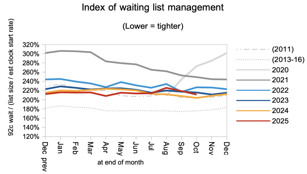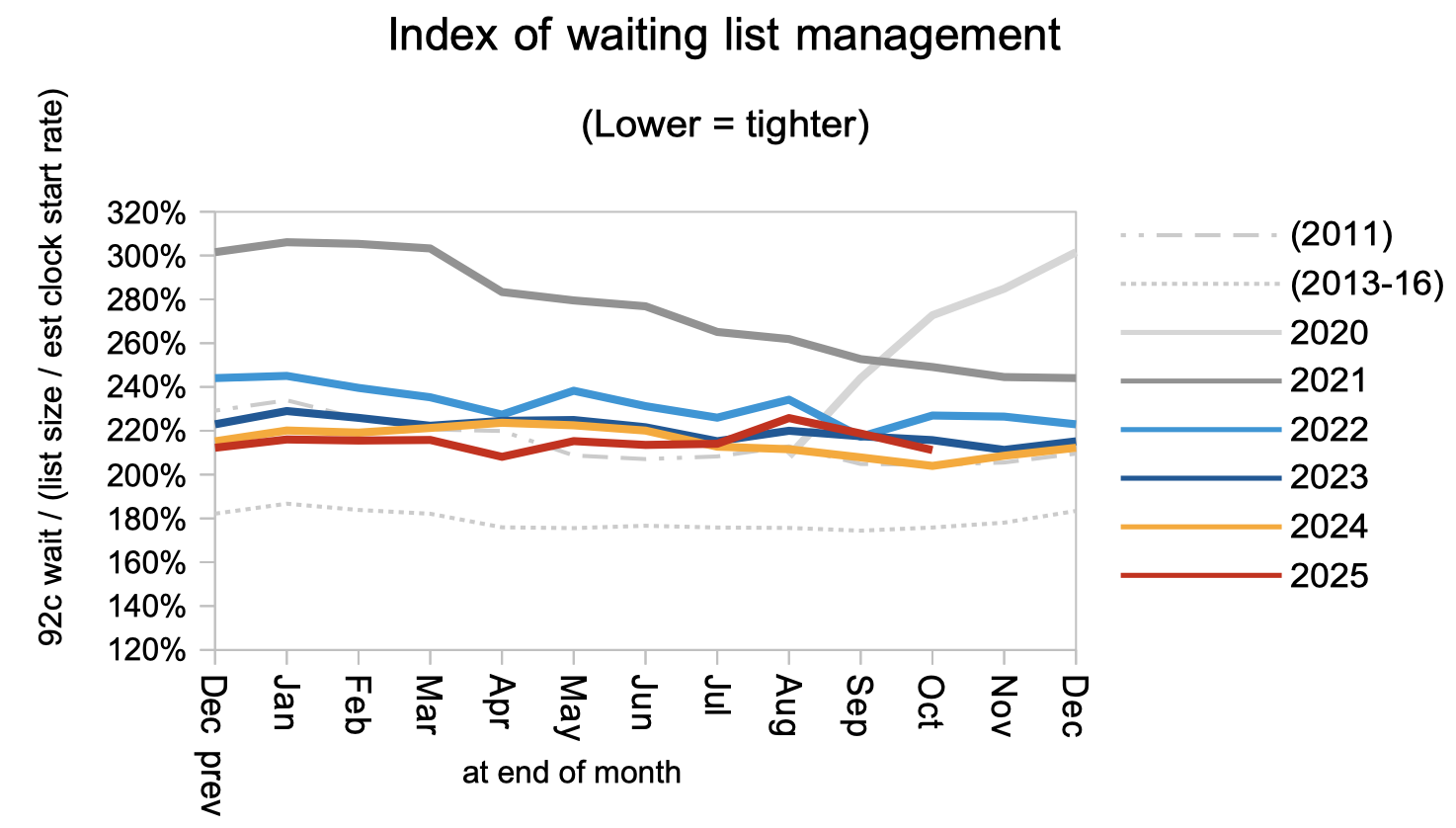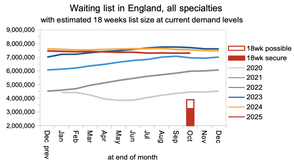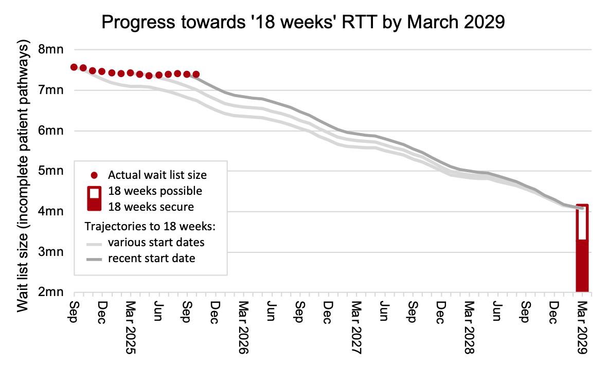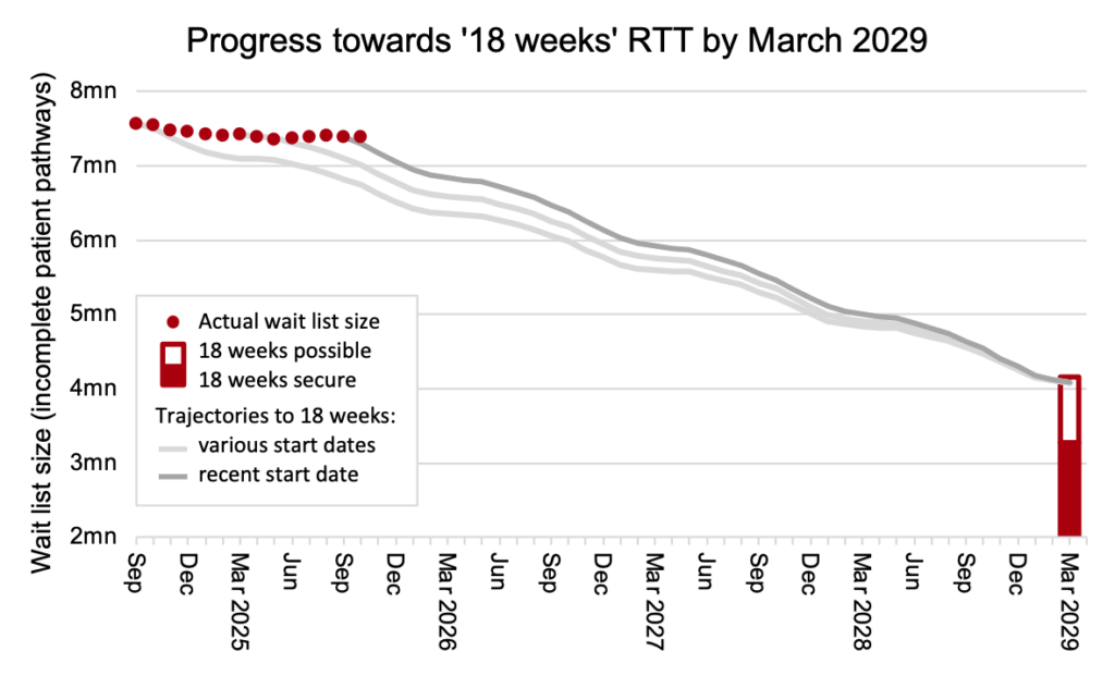 The waiting list needs to shrink to about 4 million patient pathways by March 2029 for the ’18 weeks’ recovery to be achievable. (NHS England and DHSC make a similar estimate.) If the NHS does not make enough progress one month, the shortfall does not evaporate but is added to the challenge for the remaining months. If disappointing progress continues, then at some point the trajectory to ’18 weeks’ recovery will become too steep to be credible.