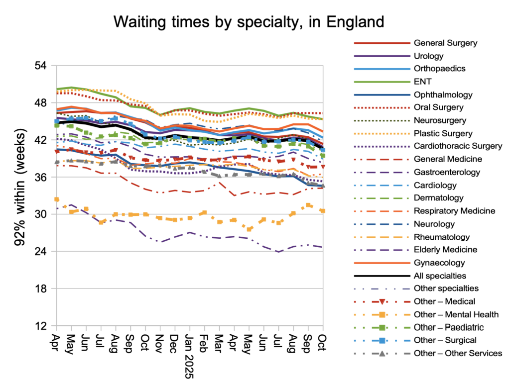 Before the pandemic, waiting times at specialty level fell into two mostly distinct groups: surgical specialties had longer waiting times, and medical specialties had shorter. Today the groups overlap, and this is not a good thing because medical specialties tend to have high rates of clinical priority.