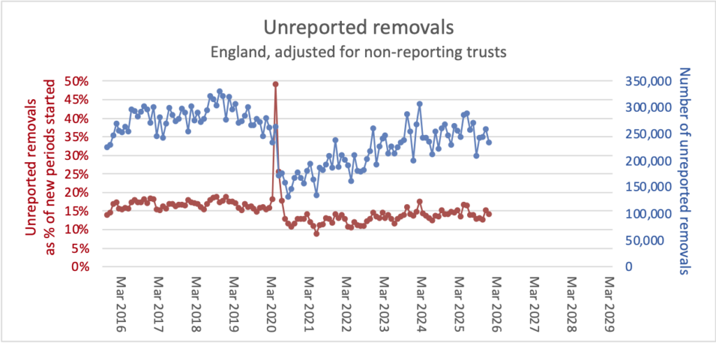 The chart shows that unreported removals were high for a couple of months in April and May 2025, both in absolute numbers and as a proportion of new periods (clock starts), when the national validation drive was underway. However November’s figures are unexceptional, so there is no indication of a major validation effort that month.