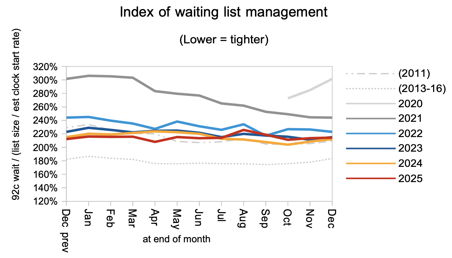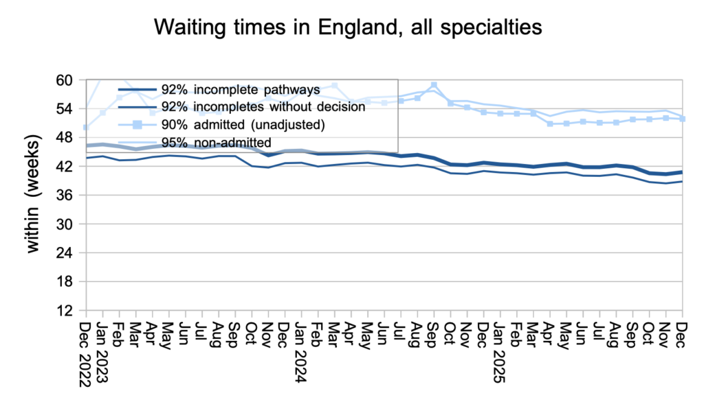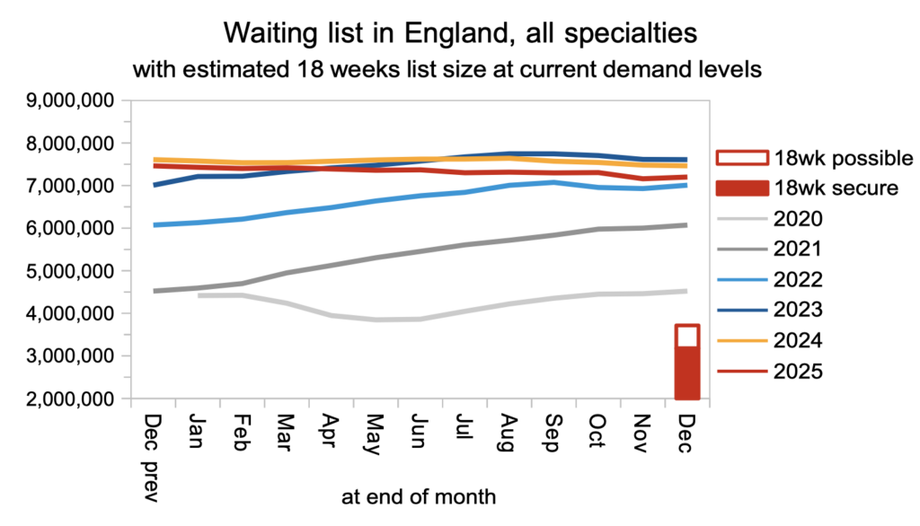 Seasonal effects would typically cause the waiting list to shrink by around 42,000 patient pathways in December, but it actually shrank by only 18,000, meaning it was in long term growth. This was also far short of the 120,000 reduction that would have put the NHS on track to recover the statutory ’18 weeks’ waiting time standard by March 2029 as the government has pledged.