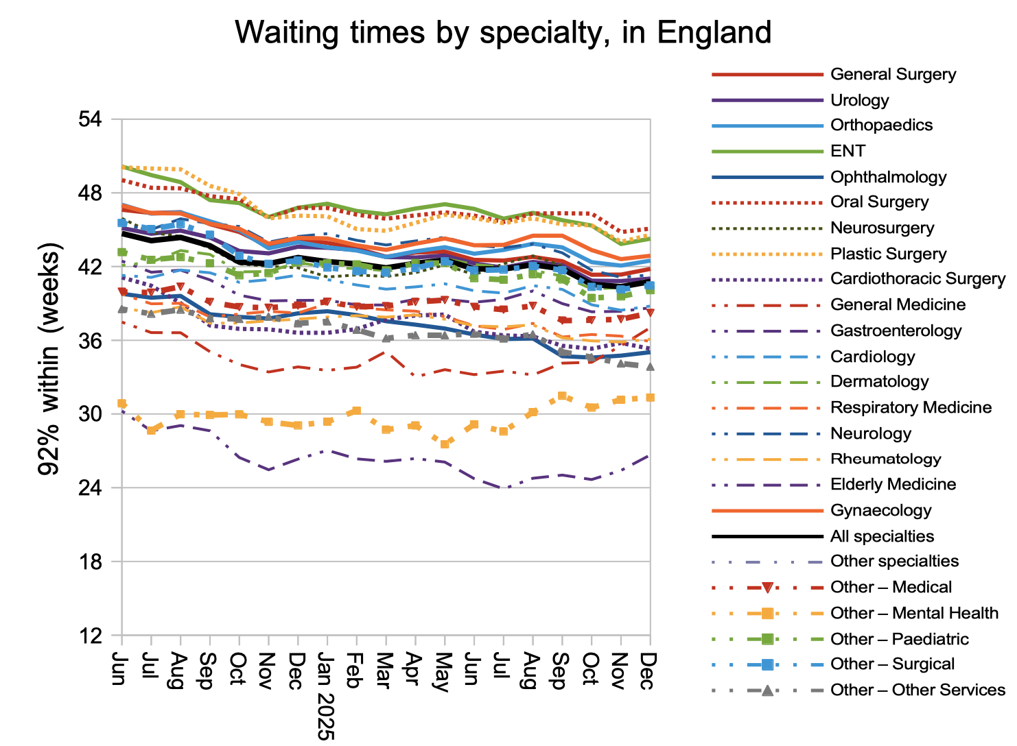 The general uptick in waiting times was shared by most specialties. Waits remain particularly long for disorders from the neck up.